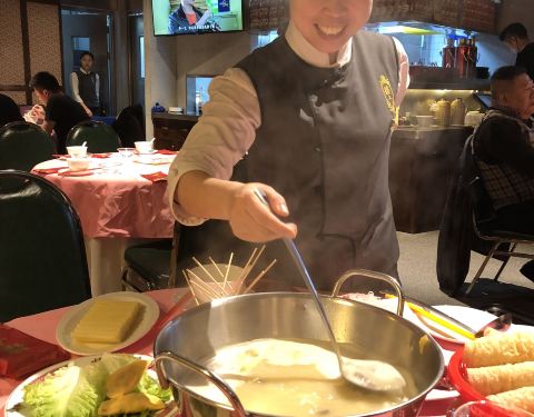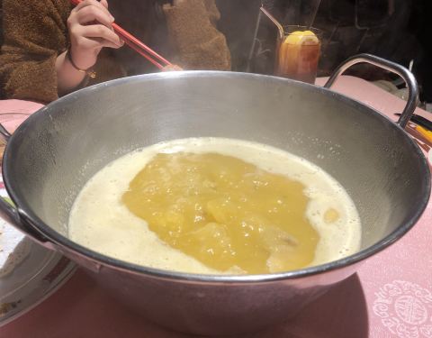 听说这里很火,在南汇路上靠近美琪大戏院,门面很小,楼梯上二楼是餐厅大堂,一看就感觉是老香港的茶楼。这里的火锅很有特色,用了很浓郁的高汤加入鸡、花胶,色泽金黄,口感鲜美,喝了汤,吃了鸡后开始涮牛肉,黑毛牛肉看着像雪花牛肉,入口即化,非常嫩,牛肉粒也是很嫩,牛脊肉感觉就差一点了,椒盐玉米是网上的推荐菜,香香的、甜甜的、嫩嫩的,象拔棒生吃了再做泡饭当主食一级棒,甜品推荐奶冻,奶香浓郁,好吃;他家的服务特别好,帅哥李佳展服务周到、彬彬有礼、最后还送到门口,值得标扬;非常享受的一餐,推荐!