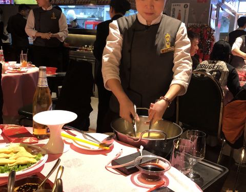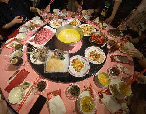 种草一段时间了,感谢疫情,让吃饭不再那么难,提前三天预约的,约到了17:30 一桌8人~全场几乎都是圆桌~包厢要额外收10%服务费,所以我们选了大厅,又省出一盘牛肉钱~ 8人选了金牌鸡煲花胶汤388元,额外加了一份花胶158元,锅底总计546元~ 椒盐蛙腿和炸栗米都是各点了2份,一份88元,总计352元,推荐椒盐蛙腿,因为没有牛蛙胸,都是腿~~ 东星斑888一斤,一条大概1.3斤,1155左右一条,鱼片涮锅,鱼头椒盐。 斑节虾 398一斤,8个人一斤刚好,服务员帮忙剥虾,虾肉清甜,不建议蘸酱料哦~ 三色牛肉船388元,牛肉片和牛肉粒组成,可惜服务员把肉煮的太老了……瞎了这个肉…… 响螺片、蚧籽墨鱼滑、牛筋丸都还不错~~ 辣酒煮花螺128元,不推荐,服务员把花螺都剥好了,少了份吮吸的乐趣,最重要的是味道不好……可惜这个花螺了~~ 杨枝甘露、奶冻味道还不错,性价比也高,13+14元哦~