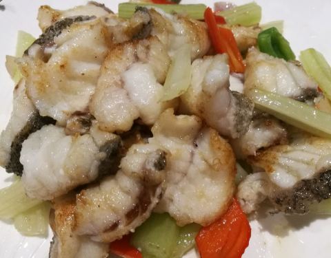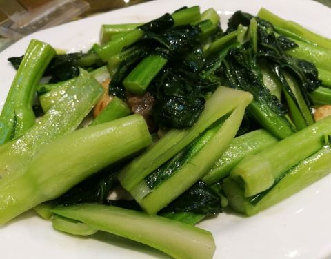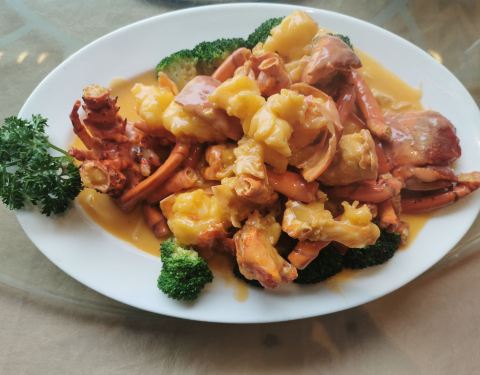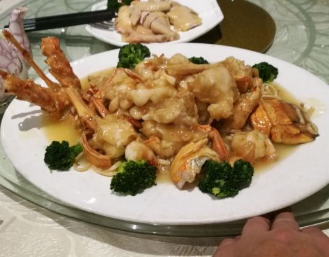 这里的海鲜新鲜,价钱不算贵,经营的模式是自己去挑海鲜,买了海鲜交给酒楼加工,酒楼收加工费。今次去点了美国龙虾和野生龙趸,龙虾上汤伊面焗,龙趸一鱼二食,起肉炒球,骨腩蒸,另外要了个炒迟菜心和半只白切...