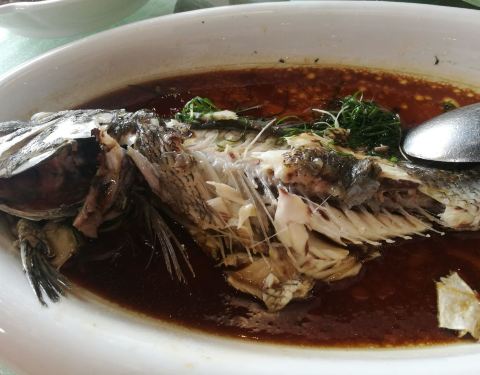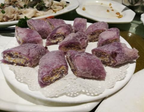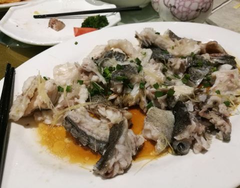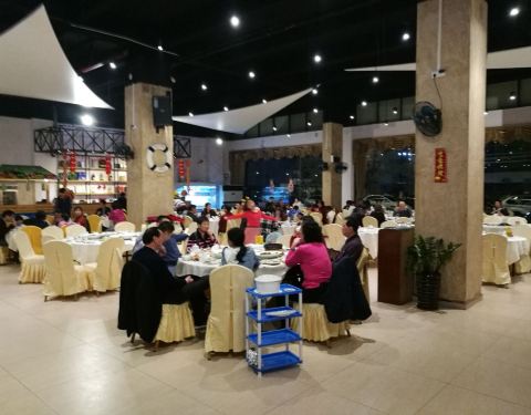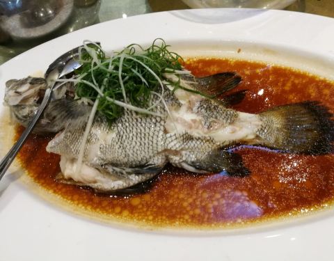 这里的海鲜新鲜,价钱不算贵,经营的模式是自己去挑海鲜,买了海鲜交给酒楼加工,酒楼收加工费。今次去点了美国龙虾和野生龙趸,龙虾上汤伊面焗,龙趸一鱼二食,起肉炒球,骨腩蒸,另外要了个炒迟菜心和半只白切鸡,再要了一份紫薯搏撑,7个人食得很饱了。花费1952元,人均285元。