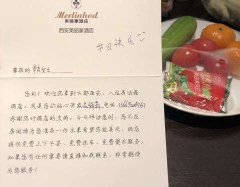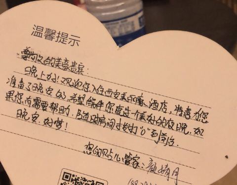 酒店环境很好,很卫生,房间很大,早餐特别丰富,去西安一定要住的酒店,价格也很划算,最重要的是服务,服务一级棒,是我去过服务最好最贴心的酒店了,每天都会送小惊喜,酒店服务人员会送你下午茶,晚安奶,在写一些祝福的小名片特贴心。下次去西安还会来