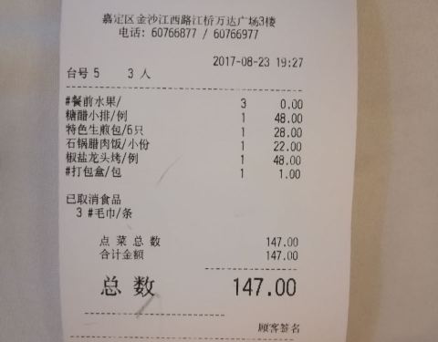 一家比较有名的中餐连锁店,但是服务感觉真的不如他们的价格那么高!如果不是支付宝口碑里抢到的50元抵用券,我想我也是不会去光顾的。 从进门就没有什么人招呼,大概生意太好,也无所谓吧!糖醋小排,龙头烤说是...一家比较有名的中餐连锁店,但是服务感觉真的不如他们的价格那么高!如果不是支付宝口碑里抢到的50元抵用券,我想我也是不会去光顾的。 从进门就没有什么人招呼,大概生意太好,也无所谓吧!糖醋小排,龙头烤说是特色主打菜,也就这样吧,量不是很多。生煎包比想象中的要大,还不错。腊肉饭也还行。上菜前会有水果供应,这是唯一赞赏的地方! 买完单还听到边上乘客抱怨从进门已经快半小时了,都没人搭理。希望店家好好改善服务!
