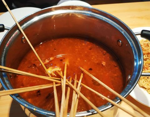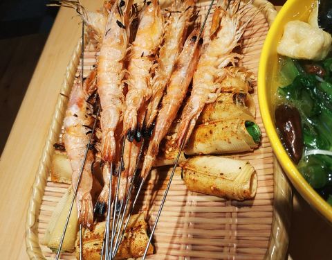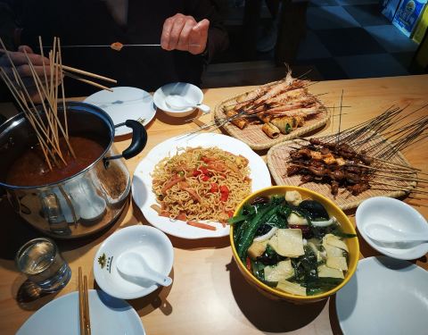 哈哈赶上了周五提前一天预约使用券,服务人员挺好的提醒周五晚上最好早点儿去找座位,否则很容易排队哦 老妈不到不到五点半就杀去了果然等我将近六点到了店里已经人声鼎沸了。来金碧辉煌串吧麻辣烫是所有吃客的良心推荐啊果断来一碗,哈哈太受了,基本她俩没有吃到,都被我自己一人独占了,最后连口汤都没有剩下,这麻辣调的刚刚好 毛肚锅里面的肚很厚实,多泡一会儿会更加入味。炒方便面口味也不是很重,感觉小朋友都可以吃 他们家各种一把串基本都点了 一把牛,一把猪都是腌制好的小串,味道相当棒,一把牛口感很劲道,适合配着小酒满满吃,绝对下酒。