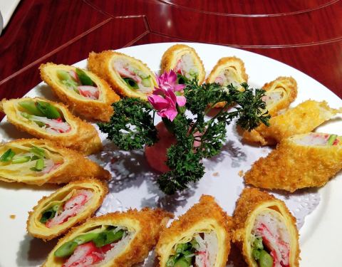 - 出品后很好看,虾肉嫩壳酥脆,好像大多抢虾壳吃了,放凉后依然很酥脆,五星推荐 海鲜春卷,48元一...