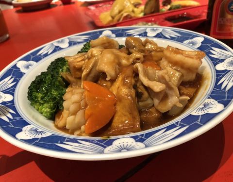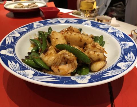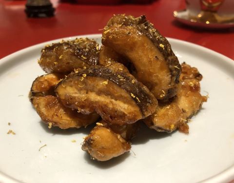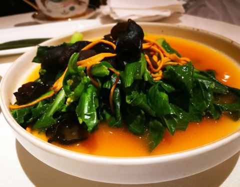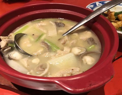 早就听闻海云陈记的大名,而且之前在鸡栈吃饭时和老板闲聊的时候他都力荐这家店,今天终于如常所愿了。饭点未到就有等位的客人,人多的话还是建议提前定位。红彤彤的门面看着很喜庆,进到餐厅内,感觉座位比较拥挤,简单的点了几道推荐菜,这里的白开水也要收费的,8元一位,所以还是叫壶茶水吧,10元一位。 金牌海南鸡,158半只,量不算少,肉质细嫩,口感不柴,不蘸料也蛮好吃的,对得起这个价位。 菌酱炒带子虾球132,最爱这个菜,微辣,虾球个大有弹性,拌着鸡油饭吃很下饭。 大良窝贴奶58,其实这个可以作为甜品来吃,毕竟有奶冻做成的吃多了有点腻。 珍菌浸时蔬75,选了芥蓝,这道菜味道一般,可能是有了龙皇汤才显得这道菜价值高。 餐厅服务堪比五星级,主动倒茶水,热情问候,礼貌迎送。让我有种再想来的欲望。