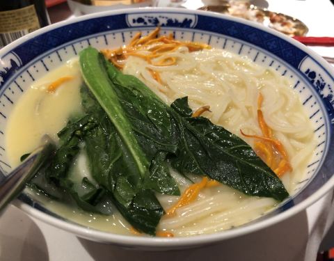 这家第一次来吃,预约到半封闭式的包厢,低消2000~能坐10人~跟大厅融入一体,刚开始吃饭特别热,后来好很多 观光电梯直达6楼 在戴森这条路上 直走就是啦~ 红色的大牌匾很容易辨认~里面也特别喜庆,港味十足~装饰有很多小细节,可惜我没有拍照,座椅很宽~ 菜单无图,但是分类后,每种都挑选了一些~林林总总也不少,可惜盘子都一样 冷菜最喜欢那个大良窝贴奶,炸鲜奶和下面油酥酥的东东 海南鸡三种酱都好吃! 炒辣蟹 298元不便宜,就是有点辣~ 山楂凤梨咕咾肉 看票圈朋友说这个好吃,就点了,酸甜度正好,85有点贵~~ 娘惹酱蒸大鱼头86元的确有东南亚风味,酸甜辣口味 八珍红烧豆腐86元,看名字觉得贵得离谱了,但是加了鱿鱼、虾球等海鲜…… 鱼汤米线 28元,里面还放了虫草花,粗茎的绿叶菜,汤底有点鱼汤的感觉,搭配其他菜吃起来还不错,而且米线劲道还不错 粉丝煲105元,贵在海鲜,超级大的扇贝丁、虾球等 猪肚鸡跟煲宫的不能比,但是当做汤头来喝,很暖身,胡椒可以再多一点点 这边的小瓶的青岛啤酒很好喝,推荐~~