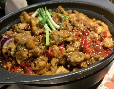 在大融城四楼,楼上全是美食,跟朋友约好了来吃牛蛙的,两个看见吃的挪不动步的人,很艰难的走到了店里。立马被桌上的牛蛙吸引,好好吃的样子。 说实话这是我第一次吃牛蛙哦,之前一直不敢吃,被朋友描述过后,非常迫切的要来尝尝。 点的青椒紫苏味的,个人感觉辣度还可以,牛蛙口感鲜嫩,加上配菜,两个女生吃到生无可恋。看见推荐相思双皮奶评价还不错,但是上来造型就这样了,表面已经有点糊了,趁热尝了一下,甜度还可以,但是有点腻。 店里空间很狭小,有点吵,装修风格中式武侠风。服务很及时。
