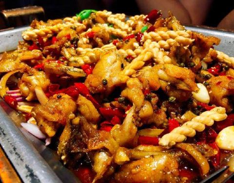大融城四楼~门口有只戴斗笠滴小蛤蟆~每次都排队人气呱呱滴~六点半到的拍了四十分钟终于得以进去~空间不大 桌与桌之间挨得很近~朋友不太能吃辣点了一个青椒紫苏口味的 量还行 蛙是小块的先过油的 配菜里面的紫...