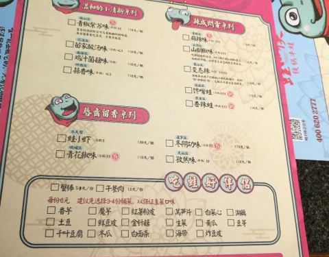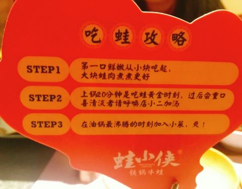 [环境]最近三次光临这家店,装修得很有特色,不仅室内装修和菜单紧紧围绕着蛙小侠主题,就连纸巾、牙签这样的小周边都是定制主题的,看得出来是用心经营品牌的店。 [服务]一进门服务员就会喊:“大侠女侠蛙小侠欢迎光临!”很热情。 「竹筒腊味饭」强烈推荐,拌匀了特别香,口味与腊味煲仔饭类似。 「烤牛蛙」比蛙锅好吃,面上撒的孜然、芝麻、花生粉真的好香。