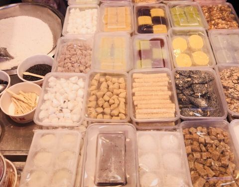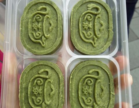 第二次光顾过的店了,就在河坊街的入口处,因为是黄金位置所以人气很旺。 10块钱一盒糕点,可以试吃,于是买了这种一盒4块的,其实也没有搞清楚这绿色是什么口味,绿茶?龙井?抹茶?不甜还可以的。