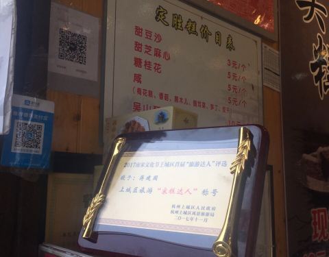 从杭州博物馆出来,进清河坊,西边路口走不多远就能看见他家,门前排了队,看招牌很有古意,于是决定试试。 [环境]旅游景点的那种卖特产的商户,环境差不多,不能堂食,都是捧在手里边走边吃。 没什么味道,只略带桂花的香气,整体来说没什么吃头。 这个至少有些甜味,但豆沙也放的忒少了,哪怕您贵一点儿多放点料呢。 [服务]还可以,也会主动推荐你试吃,招呼人还算热情。