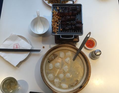 恒基中心里的餐厅生意都很好,饭点基本都要排队,还好17:30到店,坐到了靠窗位,正对大丸百货,风景么话说[呲牙]; 老板亲自上菜,服务侠其好,人也很客气️礼貌; 招牌的盐焗鸡每桌必点,半只的量还是挺大的,皮肥肉嫩,肉质一点不柴噢,米道️灵额; 鱼丸煲鲜美,里面有嫩豆腐,鱼丸和两块鱼,鱼丸真材实料,️添加面粉,里面有小刺,吃起来要当心; 虾饺一笼就1⃣️个,尝尝味道也不错,皮薄️汁水,虾仁的个头也蛮大的; 叉烧端上桌,是放在炭火上烧的,这样更加入味,一定要趁热吃,肥嫩的口感很️足; 店里环境不错,服务也耐思,下午点心还有折扣,性价比杠杠的!