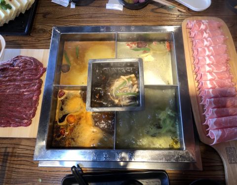 点评上搜到这家评价最高的火锅就来了,到的时候不用等位,坐定一会儿便开始排号了~ 合喜特色四季锅底49,比较有特点,顺时针方向依次是咖喱、鸡汤、酸辣、麻辣味,中间则是菌菇汤,一次可以吃到辣么多种小兴奋^_...