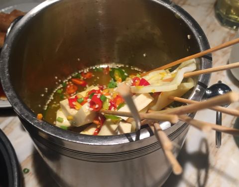 招牌神仙鸡——很赞,强推!一整只鸡,肉很嫩,一点不柴,偏清淡,又不会没味。鸡爪也是入口即化。里面还有猪脚,也非常烂糊。 番茄肉丸粉丝煲——喜欢,推荐!汤很赞。番茄汤底还有淡淡的奶味,有点奶油汤的感觉,喜欢奶油汤的一定要点。 蟹黄豆腐——这个就一般了,味道非常淡,而且有点腥味。 贵妃泡饭——中规中矩,没有云南的七彩捞饭好吃。服务员会现做,用的泰国炒米,味道比较清淡。里面还有虾仁。除了比较有仪式感,味道上不是很特别。