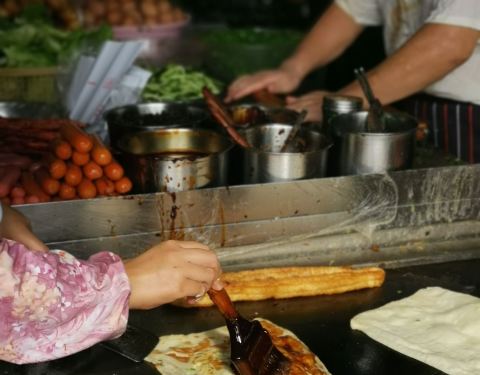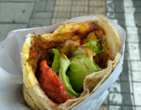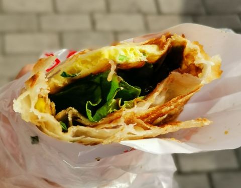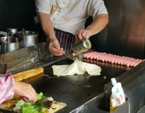 颇受欢迎的鸡蛋灌饼,特色是酱汁和咸菜