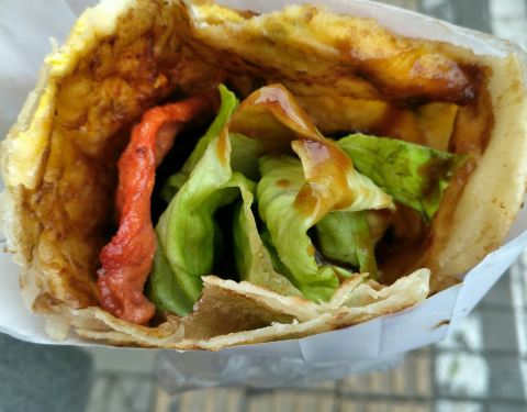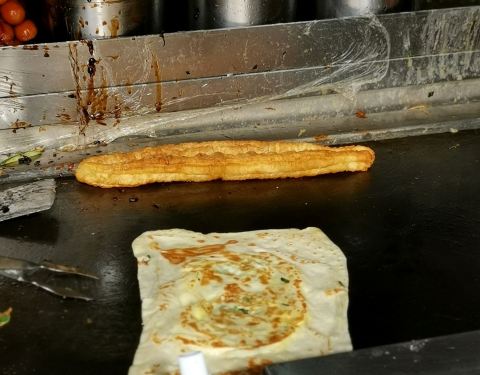 里面刷的酱是类似于甜面酱的口感,真的挺好吃的。由于已经吃过晚饭,就买了一个最基本的灌饼尝尝