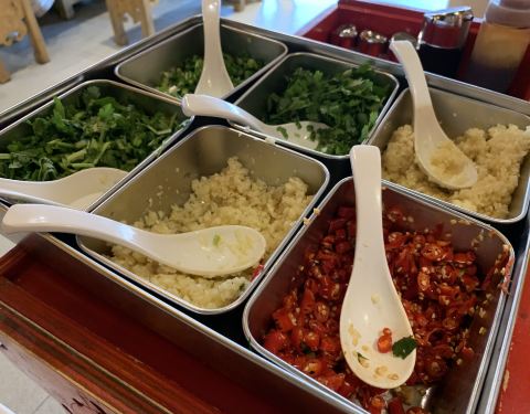 「贡菜肉丸」现做的贡菜丸子,煮熟后,贡菜吃起来脆脆的,肉丸软软的,口感丰富,不沾酱也很好吃呢! 「蔬菜拼盘」大部分放在番茄锅里煮,小部分放在菌汤里,蔬菜新鲜,大口吃蔬菜的感觉真好。 另外配了香米...