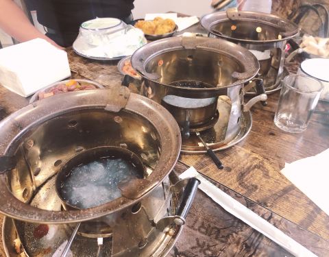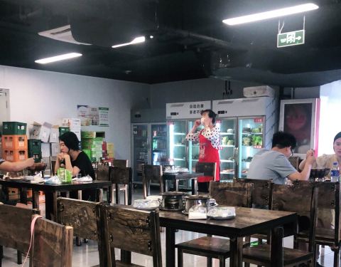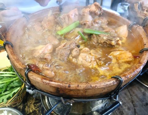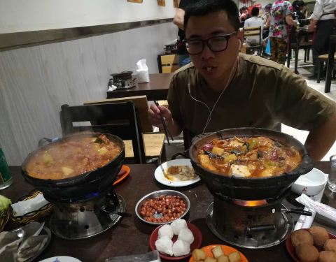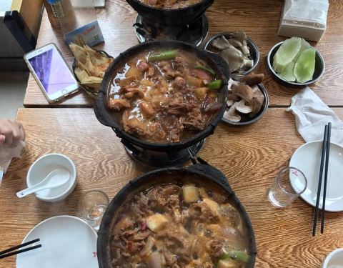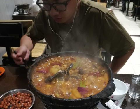 来了好几次了这次终于想起来写点评哈哈!大热天吃鸡公煲也是真爱了,小店环境很嘈杂很乱,桌子地面也很油,但是生意超好,6、7点阿里基本上都要等位了。因为不吃兔子和牛蛙,也不爱吃鸡,所以就点了牛肉煲和排骨煲,牛肉煲超好吃是我的最爱,肉片很嫩软滑,排骨煲的肉偏硬一点。这里啥都是“自助式”,哈哈,凉菜涮菜饮料自己拿,北冰洋自己拿桌子上的瓶起子开,甚至连加汤顾不过来我都是自己加了。然后就强调一点吧,不能吃辣的人千万不要点中辣!!!我觉得我还是一个比较能吃辣的人真的也吃不了中辣的,真的太辣了,微辣这种带点辣味还尝得出来别的食材的味道是最好的!关于配菜呢,个人很喜欢午餐肉和烙饼,因为火不是太旺,像藕或西兰花这种可能煮不烂,这个要注意一下。最后就是真的好吃,而且不贵~俩人吃3、40左右足够了。