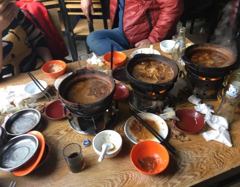 地道的苍蝇馆子,主打鸡公煲,先吃肉,后涮菜。各式小菜3-8元,便宜到哭。环境,谈不上的,服务,更是谈不上的!但好吃啊!每到饭店就排队,但桌子多,翻台快,一般饭点排半小时左右就可以吃到。鸡公煲辣度有三档...