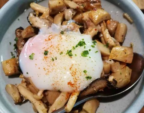 橄榄油炒杂菌配温泉蛋,杂菌爽脆,入口多汁,保持了菌类自身的鲜香,把最上面的温泉蛋充分拌匀后吃...