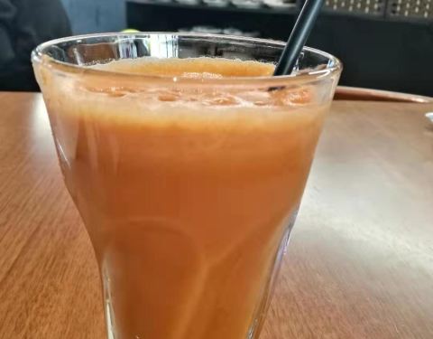 鲜榨果汁,胡萝卜和苹果汁融合果汁。 橄榄油炒杂菌配温泉蛋,杂菌爽脆,入口多汁,保持了菌类自身的鲜香,把最上面的温泉蛋充分拌匀后吃味道更佳。