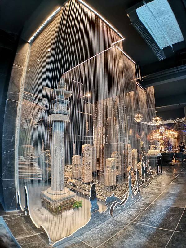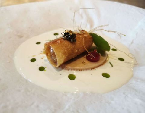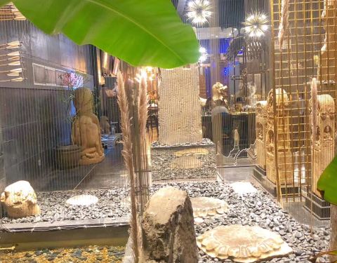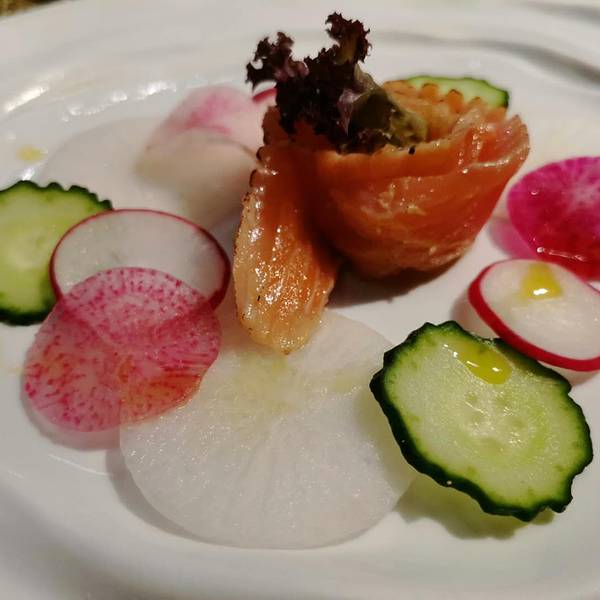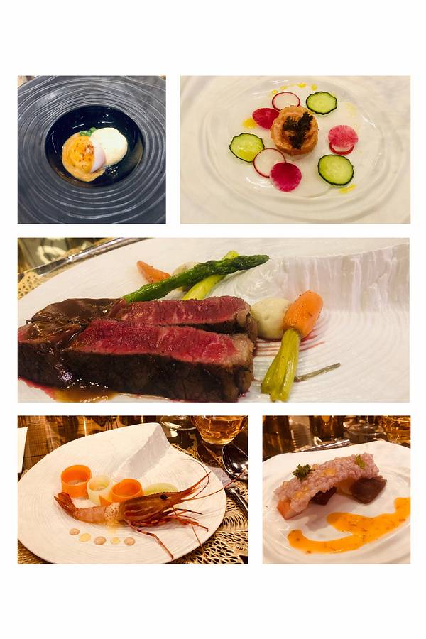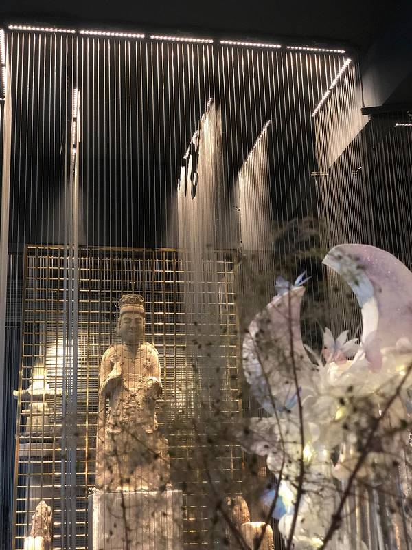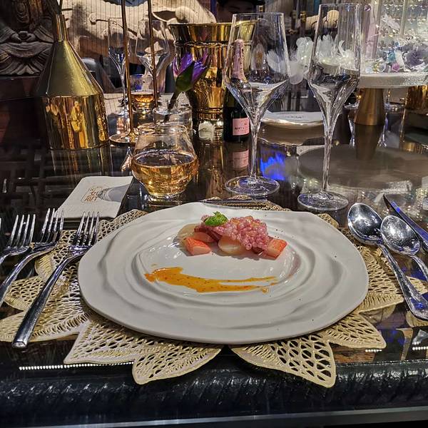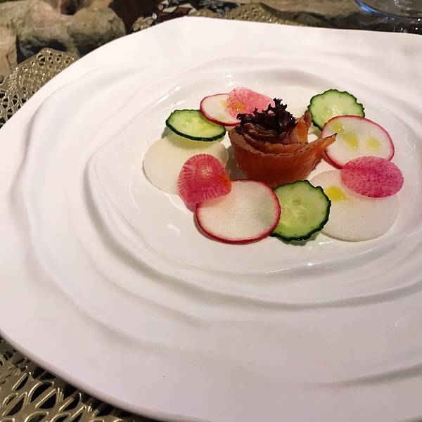 种草特别特别久了,逼格很高很宽敞而且不会太贵的中式装修的西餐厅,地址门口也很好找,在漓江郡府附近,店内收藏有很多石刻雕塑,安安静静的摆放在哪里就像沉寂百年的思考者,这次来刚好我们就遇到了开鱼仪式,说真的我们沿海居民见过了大大小小的各种金枪鱼,但还真是头一次见到这么大的蓝鳍金枪鱼,60公斤真的超级大大大,开鱼仪式由来自香港的主厨掌刀,有幸观看了蓝鳍金枪鱼的解体之路,真的来得好不如来的巧,6点,晚餐时间(北海道牡丹虾+橙香腌法罗三文鱼+昆布风味北海道帆立贝熟成蓝鳍金枪鱼+黑松露芝士酱无菌流心温泉蛋+松茸野菌汤鹅肝吐司+炭烤澳洲m3牛眼肉+甜点冰淇淋)艺术美食沿用了正式的西餐用餐仪式,从前菜到主菜都是一道一道制作,一道一道的上,完全没有长时间放置影响口感的问题,每一道菜都有讲解,边学边吃,收获的不止是我的胃,俘获的不止我的眼,还有我的味蕾与学识。