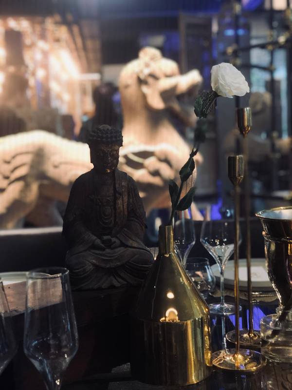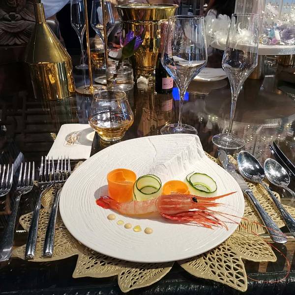 是漓江网红西餐厅第一名,仿佛置身在博物馆了,各种神像雕塑品,非常大气,入门口的门坎比平时的高,听这里的员工介绍,是代表古时候家族的地位,门槛越高,家族的地位越高的呢!摆满鲜花的走廊。撒在餐桌上的花瓣,加上优美的灯光,气氛浪漫到炸裂,拍照更是无敌好看!都说生活需要仪式感,跟心爱的他共度烛光晚餐,真是别有情调~餐厅华丽大气 上百件高古石雕加持出来的就餐氛围,加上金属线条欧式华丽风格的摆设,完美的灯光衬托出整个店面都非常闪亮辉煌!走到二楼,在露台可以俯视漓江全景,听着轻柔浪漫的旋律,喝两杯小酒,便是如此写意!室内设计仿佛穿越了,另一个主题的餐厅似的。是个白色为主题,奢华高档的就餐厅。特别适合情侣谈心或者几个闺蜜坐在舒适的沙发上聊天拍照。厨师是johnny Xu ,香港人,在外国留学深造多年,是香港最年轻的米其林主厨之一,师承美心集团高级总厨关顺发哦。本人和照片都超级像香港明星马浚伟的推荐菜品:1.北海道牡丹虾,入口即化,冰凉的温度是刚刚好,配搭芥末蛋黄酱别有一番风味。 2.橙香俺法罗三文鱼,半生熟的三文鱼,加露汁,好吃,打破了从来不喜欢吃熟三文鱼的我赞👍 3.昆布风味北海道帆立贝加金傖鱼,肉质细嫩特别好吃~地址:桂林七星区临江路258号汇景坊4栋-1-12-20号(漓江郡府营销中心旁) 营业时间:上午11:00-晚上23:00