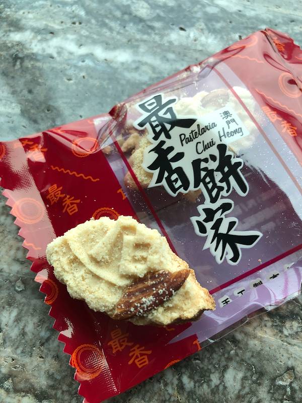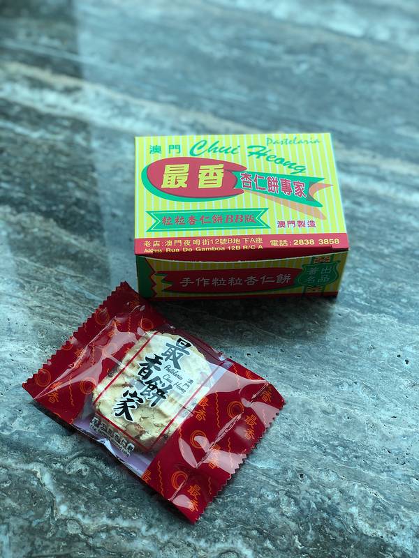 #2018.06 澳门十月初五的恋爱巷# 钜记的杏仁饼买过了。又惦记上了最香。 这里的都是纯手工制作的杏仁饼。脆脆香香,细细咀嚼还能吃得出淡淡的炭烧味儿,有杏仁碎藏在杏仁饼中。价格和钜记差不多,包装更复古。看...
