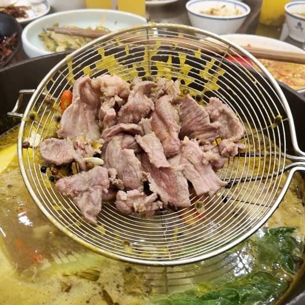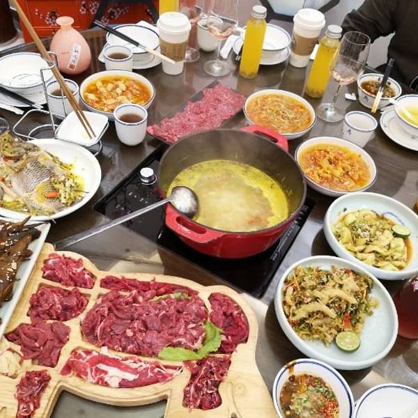 工作日的中午和几个朋友约在它家吃牛肉,刚好团购套餐中午才能用,比单点还是划算很多。去的时候人还比较少,服务员挺热情的,点菜上菜速度都可以。渐渐的人多了起来,中午能有这种上座率,看来生意确实好。酸菜牛肉锅味道很正,搭配的套餐牛肉质量好,还有卤鸭头。单点的披萨八宝饭味道一般,甜的有点过了。油呛牛肉味道很正,只是牛肉太少,感觉是在吃佐料。下次试试其它锅底和菜品,总体还算满意的一家店。