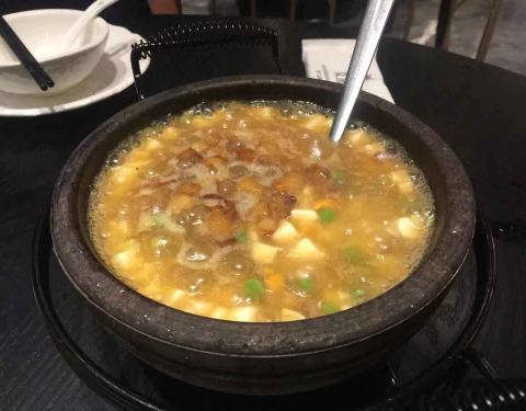 龙井豆腐,老豆腐炖的很入味,点缀了三颗雪白的虾仁,配上红辣椒和芹菜,颜色搭配很好看