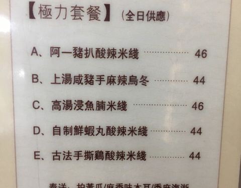 阿一猪扒米线在西营盘就开了两家店,这家店环境整洁、服务也很好。点了份最招牌的“阿一猪扒酸辣米线”,套餐还加送一份小菜,拍黄瓜或是凉拌木耳或酥炸云吞,总共只需46蚊。味道相当不错,而且份量有够大,比单...