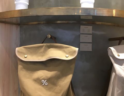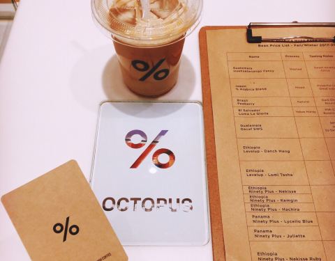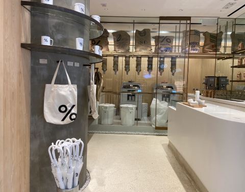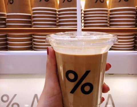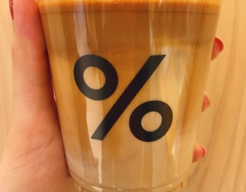 IFC这家咖啡店新开张没多久,之前的这个位置上是一家爆谷店,但自从咖啡店盘下了这个位置后,生意明显要比爆谷店好的多,可见咖啡还是更受欢迎些。店里只有少量的几个座位,大部分都只能打包带走,中午的时候排队买咖啡的白领是排成了串。百分比的符号[%]是它的logo,好些周边商品,如双肩背包、杯子上都是简单的[%]符号,时尚又简约。