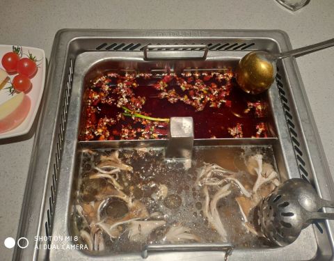 鸳鸯锅底的红油口味很地道,麻辣鲜香。 平板点菜时,又有服务员递上水果,并询问有何需要帮助