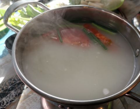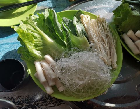 火锅除了鱼,虾,蛤蜊等海鲜,还有青菜,生菜,粉丝,金针菇,年糕等素菜,年糕和粉丝不够可以添加
