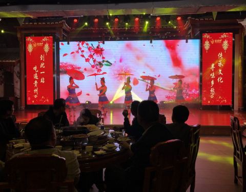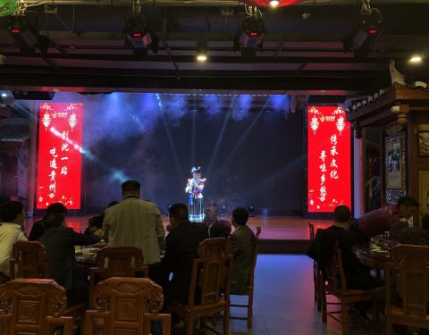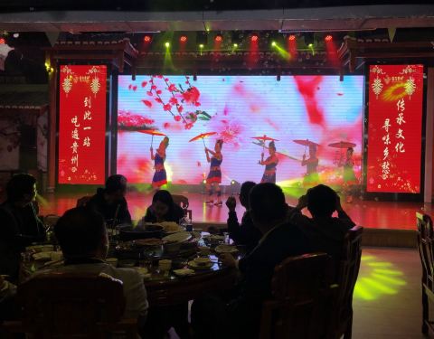 很有民族风情的一家饭店,味道不错,酸汤鱼做的很好,应该是乌江鱼做的,烤鸡和珍珠原子是特别的好吃,比想象中味道好多了,包间很多,包间的转盘都是电动的,特别大,至少可以做个15个人,背对窗这边可以看到舞台从7点半以后就可以看到表演了