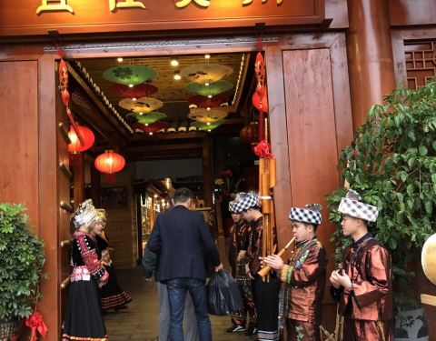 很有民族风情的一家饭店,味道不错,酸汤鱼做的很好,应该是乌江鱼做的,烤鸡和珍珠原子是特别的好吃,比想象中味道好多了,包间很多,包间的转盘都是电动的,特别大,至少可以做个15个人,背对窗这边可以看到舞...