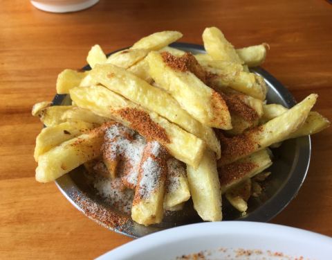 油炸的那个土豆条真的非常好吃,配上海椒面,非常好吃。那个土豆条扎得真好吃。没有吃到牛肉饼,可惜了