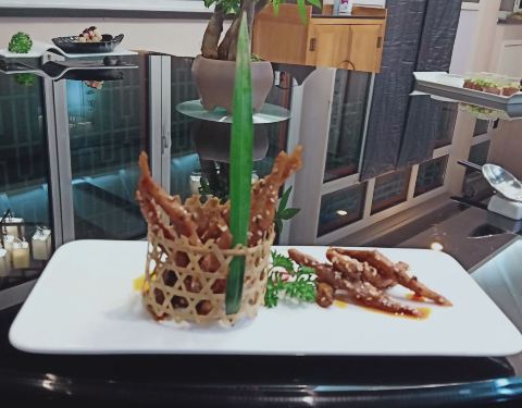 这家餐厅在天下第一关景区旁边,环境优美,跟花园似的,离第一关非常近,口味很好,菜品非常精致,我们6个人,点了一个香辣牛筋猪手锅,点了4个小凉菜,吃的挺好,下次还去。