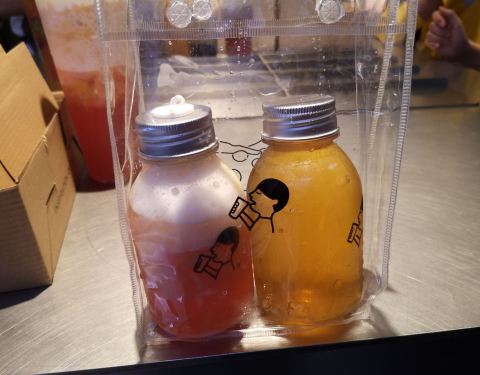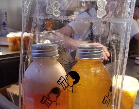 这家喜茶就在百姓广场东区的一楼过道上面,离肯德基并不是特别的远,所以很容易找的。 店铺并不是特别的大位置,只有狭窄的几个位置,但是里面就坐满了人,也站满了人,买东西要等还是比较久的。 尝试了一下,这边的bobo奶茶比较喜欢吃这边的,Bobo珍珠。 另外两杯迷你的喜茶也是挺有意思的,尤其是瓶子,挺可爱,还有一个纪念品的小袋子。