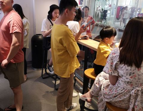 店铺并不是特别的大位置,只有狭窄的几个位置,但是里面就坐满了人,也站满了人,买东西要等还是比较久的