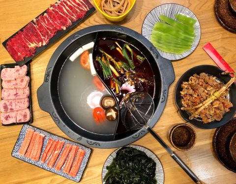 上次来买吐司都没有发现这家,看来是新开的,双人套餐这分量简直足得我嫌肉多。 【鸳鸯锅】48,本来想点红锅,但是店员突然介绍说他家的白锅是猪骨熬出来的骨汤,所以立马决定要鸳鸯锅了。其实感觉锅底的清油味...