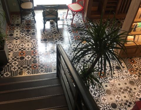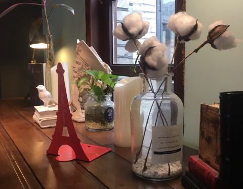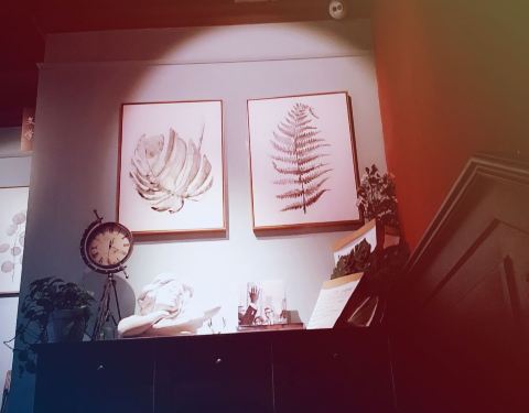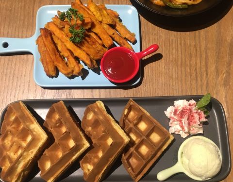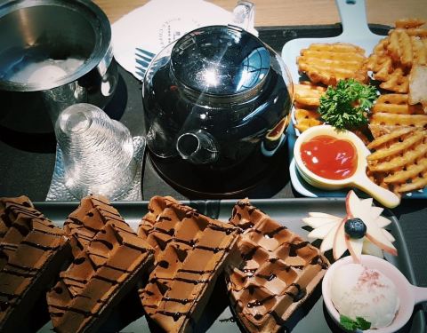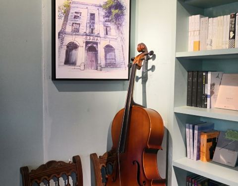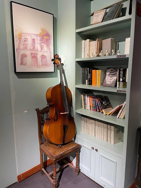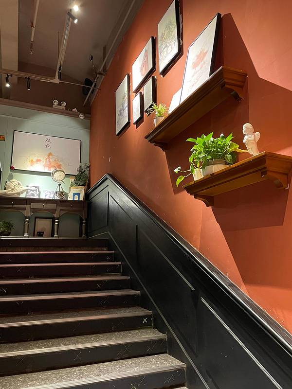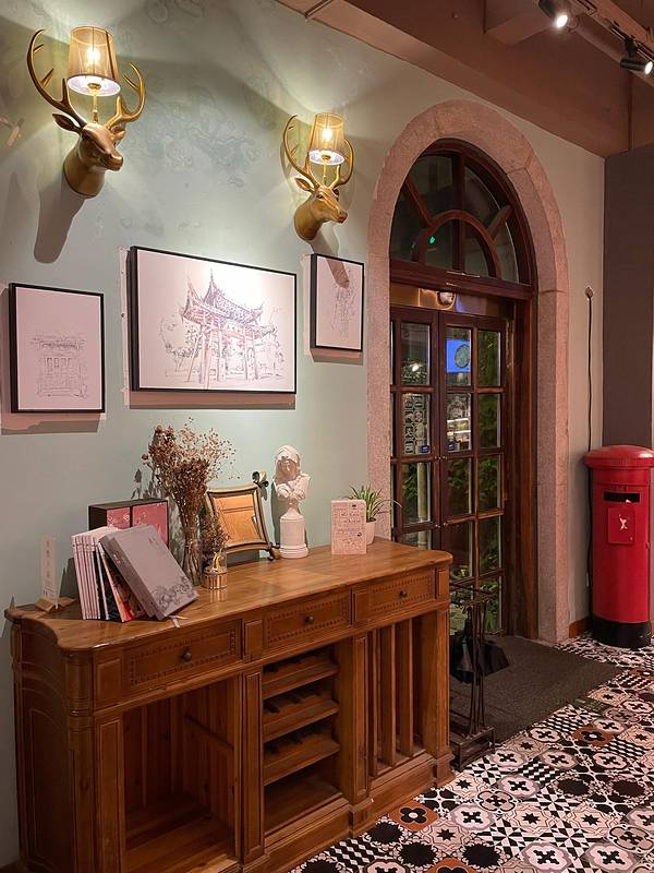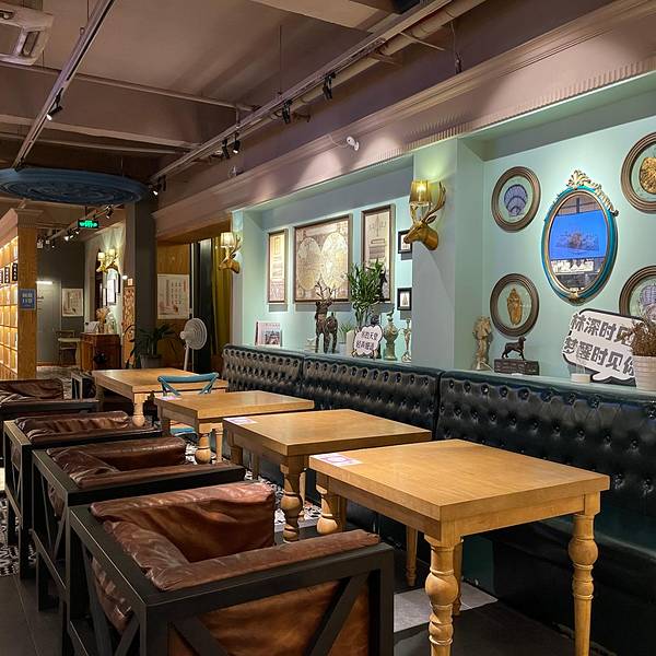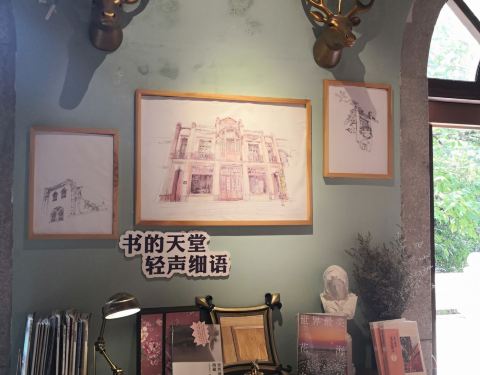 “林深时见鹿,梦醒时见你” 位于上下杭,杭舍隔壁,楼上楼下两层,哇噻!应该是4-5个门面房组成,豪华双层大别墅啊! 入口玄关有屋檐,雨天能在檐下轻松收伞,夏天也能提前进入阴凉地带,不错,摆放着活动预告牌,整个色调以湖蓝绿为主。 整墙整墙的书,书在桌中摆,桌在书中立,每张桌上都有花,摆的鲜花每一桌都不一样。 上二楼地板很像古早新加坡旧时地板装饰,风格特别。 二楼有一间包厢,还有一大片堂食座位,可以随时接受移位转换为讲座和各种活动PARTY,位置方正,阳台位置有三张桌子可以俯看上下杭。 点单,品类不少,饮品到小食到主食,除此次套餐外,外加点一份茄汁海鲜意面。 等待时刻,取书,看上几页好不惬意! 满满一大托盘食物一次性全到位,一壶普洱茶(店员温馨提醒小孩不能喝太多),搭配2个玻璃杯,杯托是锡质,有调调;原味松饼搭配冰激淋;薯角搭配番茄酱;茄汁海鲜意面看起来很有食欲,开动吧!少年! 意面入口,啊!有点辣!狂喝水,可是味道好啊!忍不住一口接一口,一口柠檬水一口面,直到一盘面见底。。。 好好喝茶慢慢享受松饼和薯角。 你的午后献给了谁,是奔波在学习的路上、还是在健身的途中、是接送孩子的时刻还是躲在窝里躺了半天,无论你在做什么?都要好好吃饭好好关心自己,都不要忘记与自己说声辛苦了,好好努力! “进门时见你,出门时想你”