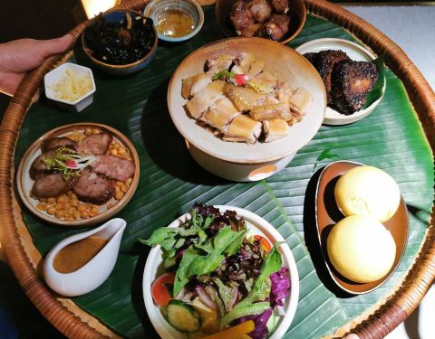 壮家簸箕宴绝对是地道佳肴,各种菜品放在匾里面,内涵黑米粽,肉肠,一品鸡,田园时蔬,黄金流沙包,烤排骨