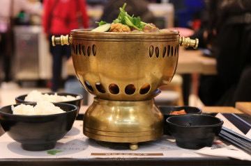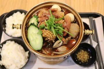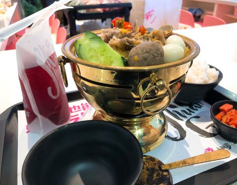 基本上的商户都是共用桌椅。小涮哥之前较流行,一人一锅干净卫生,很适合上班族解决午餐要的冬阴功海鲜锅,里面有虾、鳕鱼、花甲等,配菜是海带丝、白菜等,汤底比较淡但是味道还可以,一边力热一边吃,火大了容易噗锅。