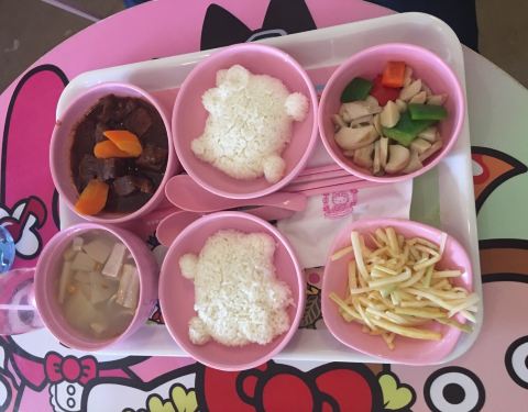 ♥️暑假再一次到hellokitty主题乐园亲子游,这次想着要把之前没去过的餐厅都去上一遍,第二家打卡的就是城堡餐厅了。 ♥️城堡餐厅是整个乐园中位置最好的餐厅,在乐园最高的建筑城堡中,整个餐厅的颜色都是粉粉的。 ♥️城堡餐厅内主要提供的是中式套餐,价格58元起步,最便宜的是家乡肉圆饭套餐58元,最贵的是沙爹牛肉饭套餐108元,其余四宝饭、香滑咖喱鸡饭、山笋扣肉饭等套餐的价格都是68元,最经典的应该是hellokitty套餐68元了。 ♥️因为在苹果派吃了这个hellokitty套餐,所到城堡餐厅我们换换口饭点了香滑鸡套餐, ♥️景区的套餐价格比外面的社会餐厅要贵,所有的主题乐园都一样,相对而言hellokitty主题乐园的价格还是算中档的吧,饭菜倒是吃的挺落胃的,菜还吃不完,米饭的话小朋友吃刚刚好,大人尤其是爸爸会不够需要添饭的。 ♥️餐具很漂亮,用这么漂亮的餐具盛装食物真的很开胃啊,菜也烧的很好吃,荤素搭配营养丰富、且食材的色彩搭配也很出色,咖喱鸡里面鸡块挺多的,汤汁浓稠入味,香滑鸡蛋特别的剔滑,而且内层是用不锈钢碗蒸制的,比老娘舅等社会餐厅用塑料杯直接蒸健康多了。 ♥️餐厅内有自助售货机可以买饮料,常见的可乐、雪碧、果粒橙的价格每瓶10元,供大家参考!