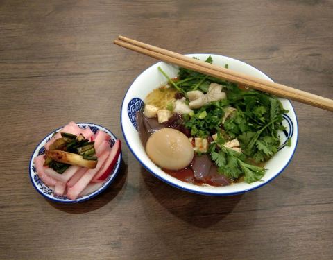 老贵阳小吃――10元。著名的肠旺面只有贵阳独有,咋能不尝?!顾名思义有猪大肠和猪血的面条。记得当年首次品尝,那红油汤辣的不行!今天特意吩咐仅放一点辣,终于全部吃光!