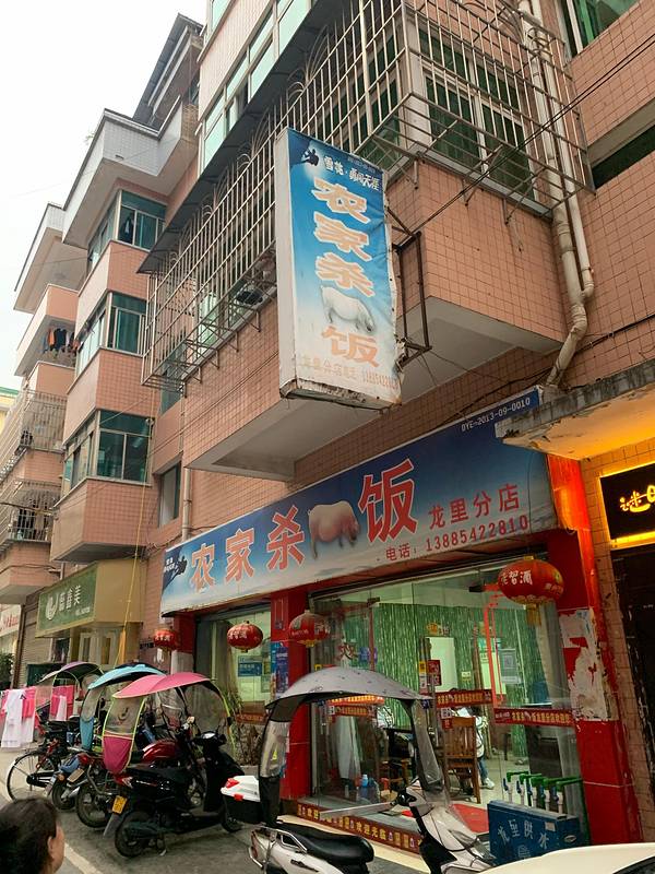 在龙里水乡游玩出来以后正好到下午饭点,遂决定吃了晚餐再回贵阳。在朋友的推荐下来到了开了10多年的农家杀猪饭饭馆。杀猪饭,顾名思义,杀猪的时候才能吃到的美食,最在意的就是食材的新鲜程度,食材要够鲜甜。 关于停车:饭店门口的小路是单行线,进入时注意不要逆行。小路两侧有免费的划线停车位,但是几乎没有空闲的车位,停车完全拼运气;进店后店家主动招呼,看着我们有带2岁小孩,为了安全,让我们坐在包厢里。店里总共有4个包厢,有配置麻将机。人均消费:30元,不需要另外多加菜,能吃饱。性价比很高。 特点: 1、没有点菜环节:杀猪饭是按照人头计费的,如无特殊需求,不需要点菜,店家自会按人数适当安排主菜的分量。(杀猪饭28元/人,米饭2元/人)。 2、赠送配菜、凉菜:贵州县城里做火锅、干锅的餐馆几乎都是如此,配的蔬菜和凉菜(酸萝卜丝、酸菜拌折耳根、炸花生米)、萝卜汤和生猪血。 味道:他家的杀猪饭随主流,用贵州传统的糟辣椒炒制(现炒),糟辣椒的味道比较正宗,放入蒜苗和芹菜。锅里是大杂烩,猪身上所有部位的肉和内脏几乎都有。最好吃的是回锅肉,其次是瘦肉和油渣,食材很新鲜。肉皮、肚条、小肠偏硬,且入味不够。赠送的萝卜汤挺不错,最后结束前来一碗,可以消解油腻,溜溜缝儿。配的蔬菜洗得很干净,挺甜的,大部分是叶子,入锅后不需要煮太久即可食用。