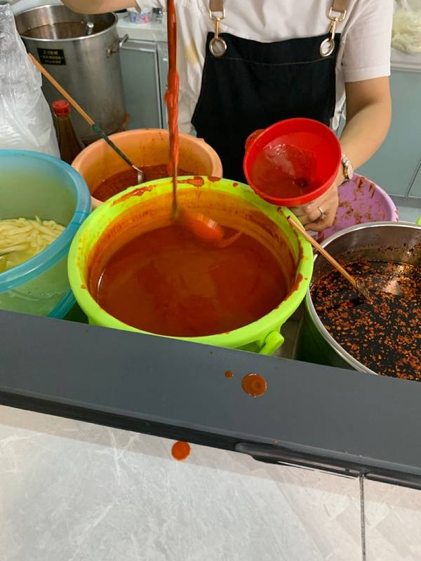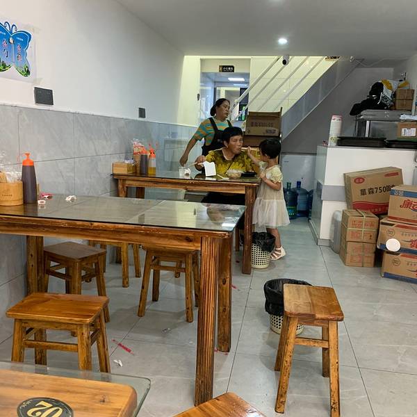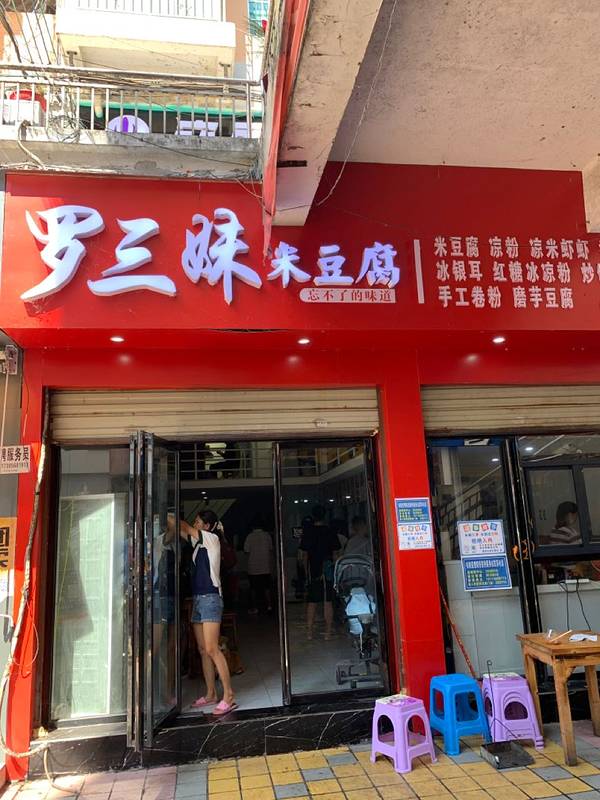 国庆长假到贵州省松桃县游玩,听酒店的前台人员说县城里的罗三妹米豆腐小吃店很有名气,人气很高,早上退房后便前去探店。 停车:店门口的大路上有少许停车位,但是几乎没有空位。唯有距离50米处的盛世兴城小区可以停车。停了一小时,5元。 环境:店铺位于商业街的临街一侧,门口的地面上有明显污渍,潲水桶就放在店门口,且没有加盖。还没进门就让人对卫生状态担忧。但是没想到进门后就餐环境和门口所见迥异。右侧一排都是开放式的厨房,对后厨一览无余,干净整洁。上方玻璃上贴了不下20种小吃品种,让人眼花缭乱。 米豆腐:他家的招牌自然必须点一份,和所有其他地方的米豆腐都不一样。这是方方正正的一大块, 从绿色塑料桶里舀出的特别粘稠的红色酱料满满地覆盖住了主角——米豆腐。红酱是这一小吃的灵魂,不仅仅是油辣椒的香味,滋味更加醇厚,只是稍微咸了一点。 凉面:与平常的凉面差异不大,只是多加了一些海带丝,油辣椒偏像于糍粑辣椒的风味,和米豆腐里添加的浓浓的一瓢酱料不同,凉面里只有少许的辣椒油,吃起来比较平庸。 冰稀饭:“冰冻的八宝饭”,这是我给起的最贴切的名字,以便明显区别于白稀饭。白糖夹杂在稀饭当中,比融化在其中的更好吃。里面加了软软的花生,冰镇的口感让人在炎炎夏日大呼过瘾,非常推荐! 价格:人均10元左右,性价比极高!
