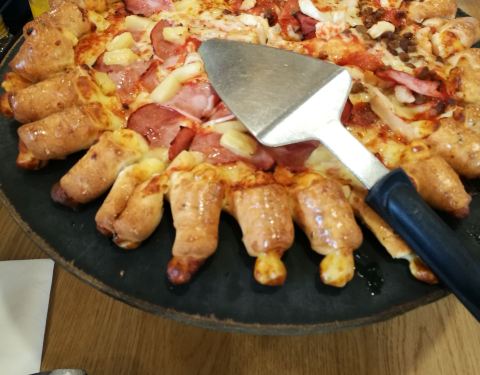 这家必胜客是在一个很大的购物中心的边上,我们中午去的时候还没有开始营业,直到12点才开门。餐馆不太大,桌椅布局比较紧凑,好在即使我们去的那天是假日,客人也并不多,还有不少桌椅空着。这里提供披萨自助餐,对于喜欢多吃几种口味披萨的客人是一个不错的选择。我们没有吃自助,因为我是一如既往的喜欢必胜客的沙拉,自己挑选食材和调料,在所点的披萨上桌前就可以吃得半饱。这里的服务非常好,工作人员都很友好。