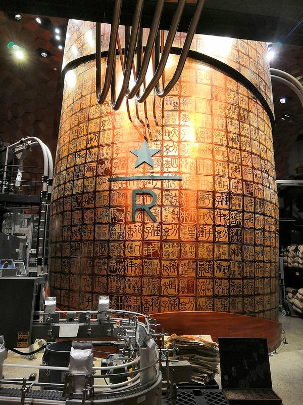 亚洲首家全沉浸式咖啡体验店,2700多平米。很喜欢它家的互动性,能看到咖啡通过管道从生豆到烘培成熟的过程。特别吸睛的是有1000多个中国传统篆刻印章图案的罐身,体积庞大。上楼发现不但有咖啡还有茶饮等选择。通过IPAD下单,一杯创意的饮品就可喝到,推荐暗涌、外滩雾晓。一楼有专业的面包烘焙,当日新鲜出炉,披萨、肉桂卷、可颂、提拉米苏尽显意式风味。